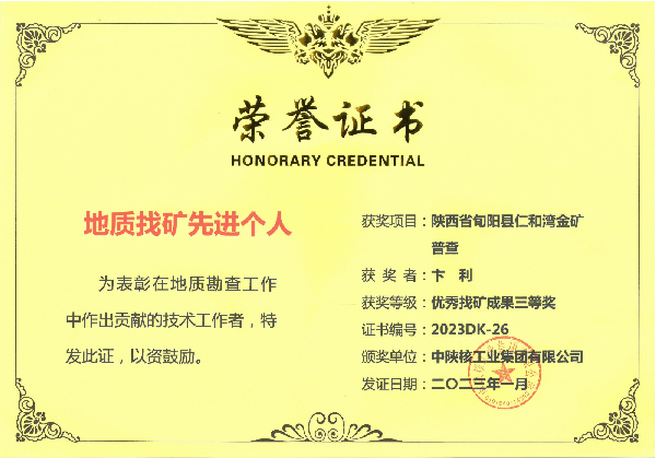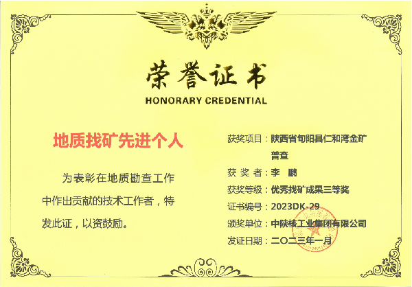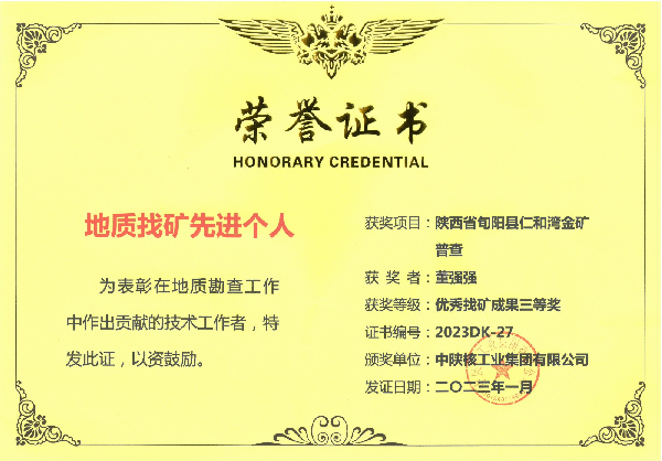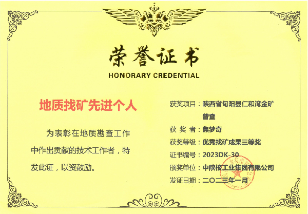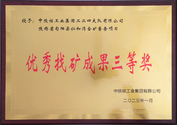 中陕核工业集团有限公司2022年度优秀找矿成果三等奖 陕西省旬阳县仁河湾金矿普查项目