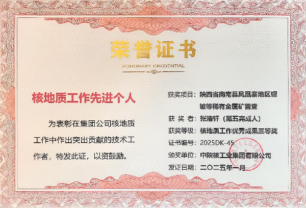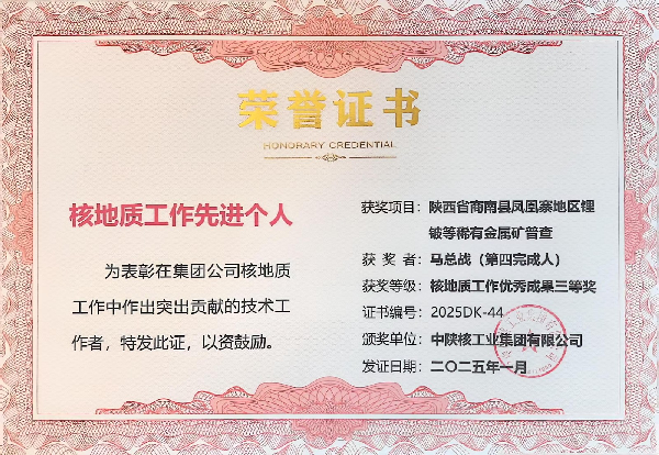 中陕核工业集团有限公司2024年度优秀找矿成果三等奖 地质调查院陕西省商南县凤凰寨地区锂铍等稀有金属矿普查项目