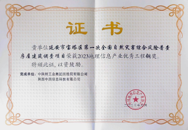 [2023-11-20]中陕核工业集团测绘院有限公司荣获中国地理信息产业协会 “2023...近日,中国地理信息产业协会发布“2023地理信息产业优秀工程获奖项目公示”,中陕核工业集团测绘院有限公司申报的“延安市宝塔区第一次全国自然灾害综合风险普查房屋建筑调...