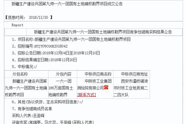 [2018-12-21]中陕核测绘院成功中标新疆生产建设兵团第九师一六一团国有土地确...12月19日下午,中陕核工业集团测绘院有限公司新疆分公司传来喜讯,凭借测绘院的自身资源优势和综合实力,在与另外两家甲级测绘单位的竞争中,脱颖而出,成功中标《新疆生产...