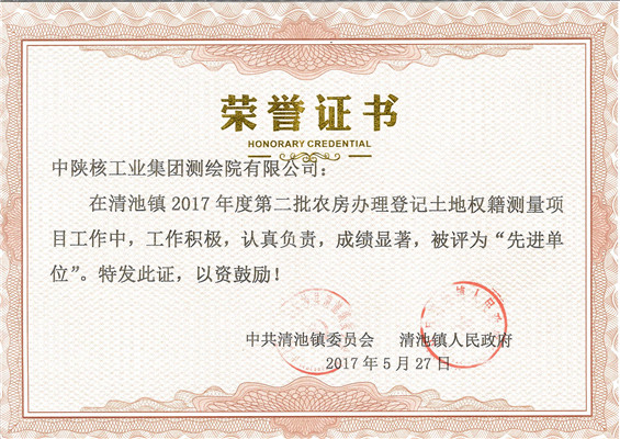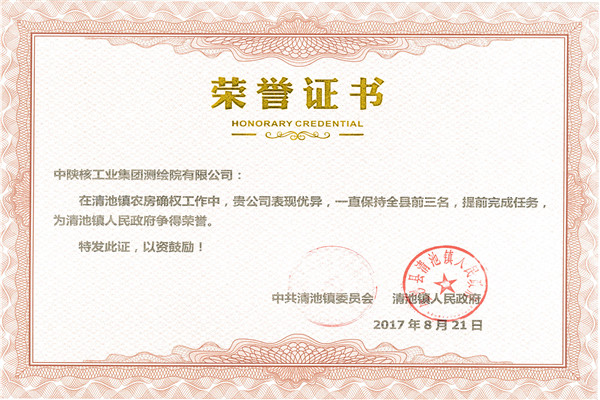 [2017-08-25]中陕核工业集团测绘院有限公司贵州清池项目再获荣誉5月31日,中陕核工业集团测绘院有限公司清池项目部先后完成了清池镇政府、国土局、不动产登记中心局、县政府的考核指标,将清池镇农房确权工作推进到了全县第一名。6月30日...