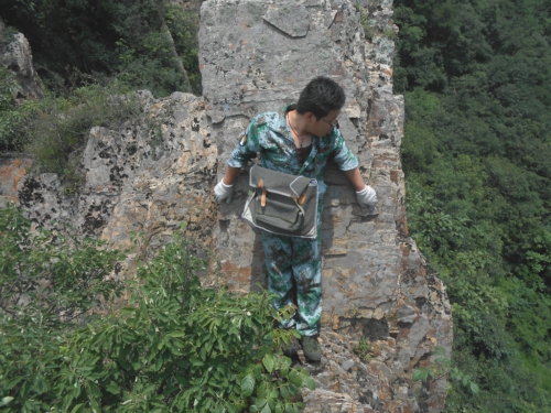 图上是陈哥和我爬上海拔1294m的山顶后拍摄的,该点点号D2410,是一个伽玛异常点。测量时,我们在前一个点就发现伽玛值偏高,而那座山体倾角已超过70度,所处的石英片岩区域风化程度很高,有些地方一脚就可以把岩石踩断。但陈哥说这里异常值较高,我们需要上到那个点,测量这条异常带延续到什么位置,于是我俩提了提裤腰带,找能踩脚的位置慢慢往上爬。终于,我们登上了山顶,测量和记录好数据后,却发现根本无法原路返回,于是就选择了照片上陈哥脚踩的那个陡崖,崖壁最窄的位置只够放两只脚。还好陈哥的野外工作经验丰富,在他的带领和指导下,我们终于幸运的爬到了旁边的山梁上,从而安全的下了山。双槽地区地层陡峭,岩体切割强烈,断崖峭壁较多,这也只是我们一个普通小组的真实写照。