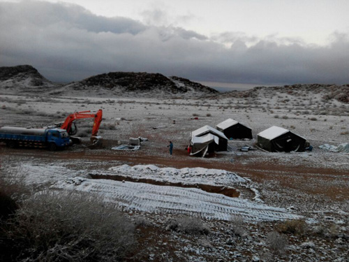 依稀记得3月份刚到这时,漫天飘雪的场景。零下20℃的气温,齐膝深的大雪,刺骨的寒风打在我们脸上犹如刀割一般疼痛。由于地广人稀,生活和生产用水都需要到十几公里以外的白杨河去拉。这种反常的气候类型与生活差异,给刚到这里的我们来了个当头棒。尽管外界条件十分艰苦,但大家在这片老一辈地质工作者曾经挥洒过无数汗水的热土上,重拾白杨河精神,用坚定的信念和顽强的意志克服着一个又一个困难。