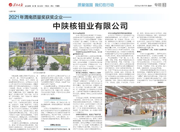 近日,通过《渭南市人民政府办公室关于2021年渭南质量奖渭南质量奖提名奖及标准化工作先进的通报》(渭政办发[2022]71号)文件获知,中陕核钼业有限公司成功荣获“2021年渭南质量奖”。12月17日,《渭南日报》刊载了相关报道。