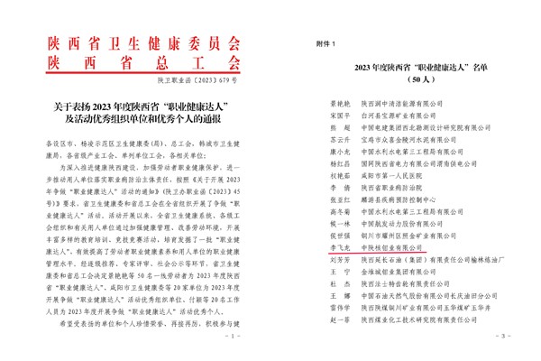 近日,陕西省卫健委和省总工会联合举办的争做“职业健康达人”活动结果公布,中陕核钼业有限公司安全环保部部长李飞龙获评2023年度陕西省“职业健康达人”荣誉称号。