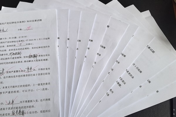 会上,由5名党员分别带领大家学习了《中国共产党纪律处分条例》(以下简称条例)第二编“对违反政治纪律行为的处分”、“对违反组织纪律行为的处分”、“对违反廉洁纪律行为的处分”、“对违反群众纪律行为的处分”、“对违反工作纪律行为的处分”、“对违反生活纪律行为的处分”及第三编附则的内容;领学结束后,当场组织开展了知识测试答题。测试题以填空、选择、判断、简答题的形式,全方面综合检验了党员对《条例》的掌握程度。