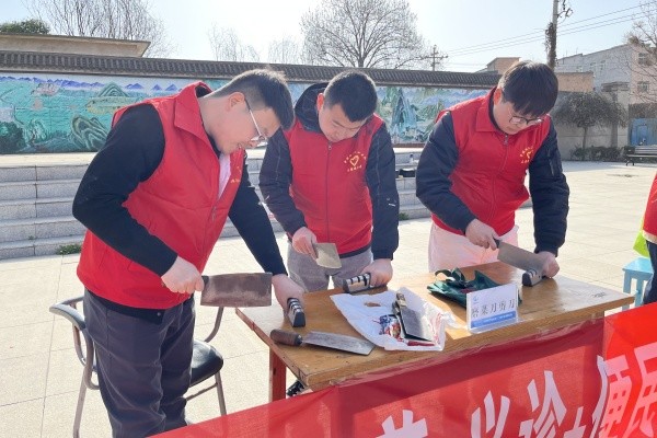 磨刀服务区前,每位居民群众挎着一布兜的刀具有序排起了长队。团员青年志愿者精心打磨,手法娴熟,动作沉稳,原本钝旧的菜刀剪刀便焕然一新,变得锋利无比。群众们看着重新焕发生机的刀具,对志愿者的技艺赞不绝口。一块磨刀石,磨利的不只是刀具,更是大家生活的便利。