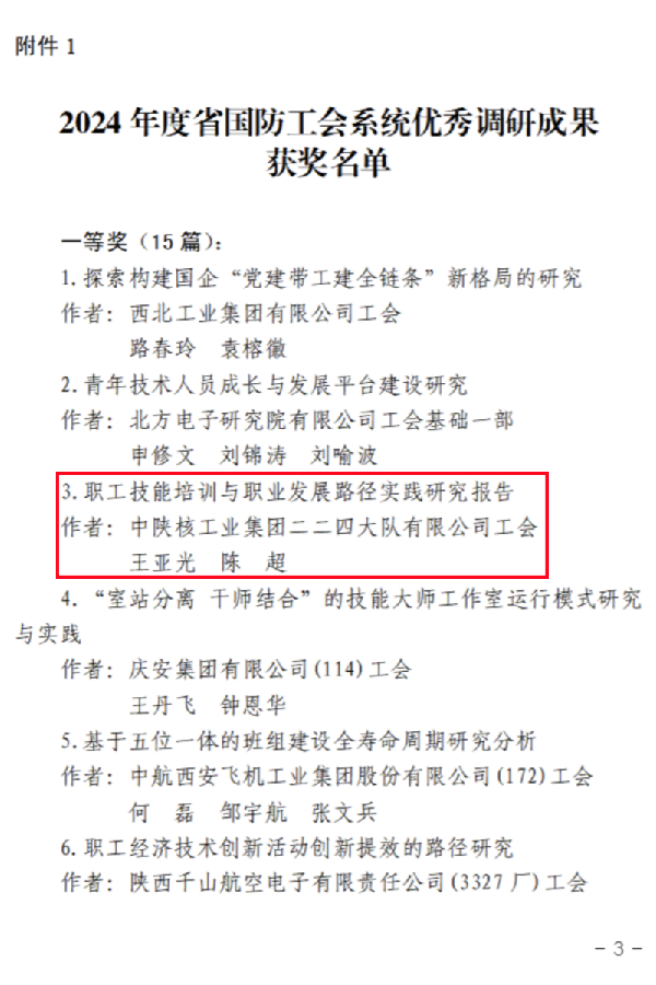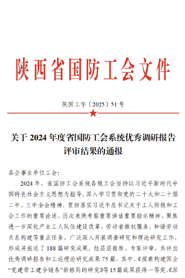 近日,在2024年度省国防工会系统优秀调研成果评选活动中,由王亚光、陈超撰写的《职工技能培训与职业发展路径实践研究报告》荣获一等奖,郑银龙、刘建文撰写的《“职工书屋”建设和作用发挥情况研究报告》荣获三等奖。
