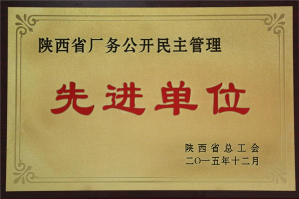 1月29日,在陕西省总工会召开的陕西省厂务公开民主管理工作先进单位表彰大会上,我公司被授予“陕西省厂务公开民主管理先进单位”称号。