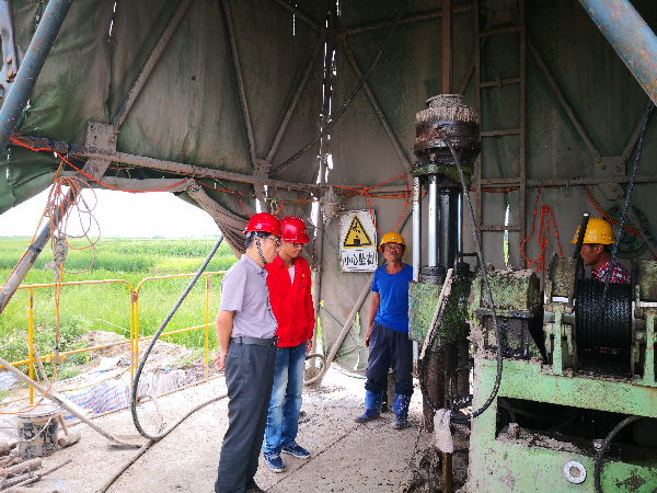 陈总在项目经理王文波和党支部书记程德进的陪同下,到齐齐哈尔市江桥镇钻探施工现场进行安全生产检查,现场听取了地质工程公司项目经理李海亮对目前钻探施工情况的汇报。陈总就野外一线安全防护、安全生产、施工质量三个方面提出要求,一是切实做好防暑降温工作,确保施工安全;二是进入雨季,要及时关注天气预报,做好施工现场防洪、防汛、避雷等安全措施;三是钻探施工与地质、物探、水文编录人员要相互配合,保质保量完成本年度工作任务。
