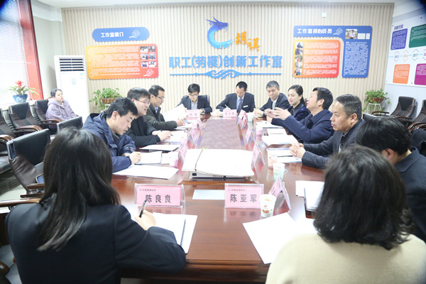2月26日下午,省国防工会经济部副部长唐晓峰、主任科员何浩斌与全国劳?!巴醴汕攀〖都寄艽笫ぷ魇摇贝啡送醴汕乓恍?人,到中陕核二二四大队有限公司对“胡祺职工(劳模)创新工作室”进行验收。