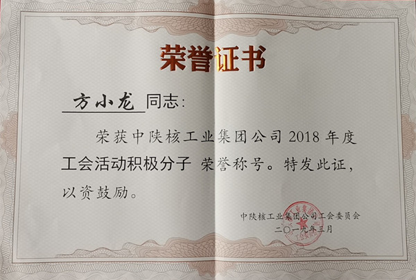 2019年以来,公司工会荣誉接二连三,多项工作受到上级工会肯定和表彰:其中公司工会荣获省国防工会2018年度重点工作完成情况优秀单位荣誉,被中陕核集团工会授予2018年度先进工会荣誉;胡祺创新工作室被命名为陕西省国防科技工业职工(劳模)创新工作室,中陕核钼业有限公司分会荣获陕西省国防科技工业先进职工小家。另有多人次受到上级工会表彰,其中:胡祺荣获陕西省国防科技工业劳动模范称号,刘海峰荣获陕西省国防科技工业劳动竞赛委员会2018年度“安康杯”竞赛先进个人称号,陈亚军荣获陕西省国防工会优秀工会工作者称号;南燕、方小龙荣获集团工会2018年度工会活动积极分子称号;张熊猫、叶兴超被评为集团公司庆祝改革开放四十周年《我们都是追梦人》职工主题晚会优秀演职人员;姚国珍荣获陕西省国防工会庆祝改革开放40周年主题征文三等奖。
