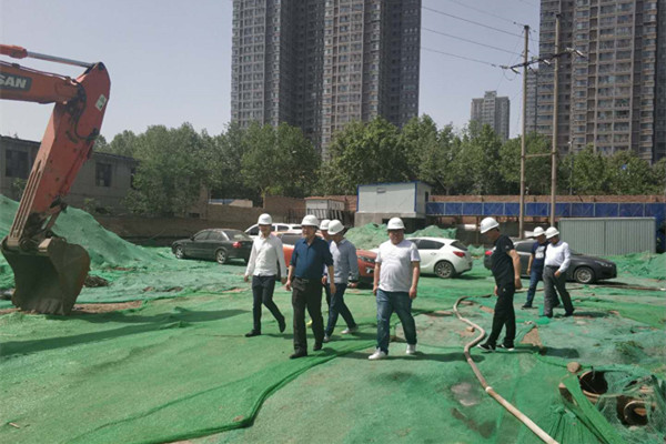 郭金锁一行深入施工现场,详细询问了项目建设前期情况,检查了已完成施工的18口降水井,听取了李罡关于项目工地洗车机、沉降池、监控室、实名制通道、木工棚、标样室分布情况及下一步护坡桩工作计划的汇报。