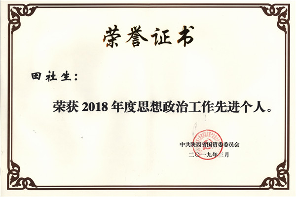 田社生喜获“陕西省国资委思想政治工作先进个人”荣誉