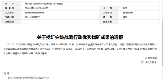 2020年11月,为全面总结2011-2020年找矿突破战略行动实施以来取得的优秀找矿成果经验,宣传优秀成果,在集团公司高度重视下,公司积极按照自然资源部办公厅发布的《关于开展找矿突破战略行动优秀找矿成果评选工作的通知》(自然资办函〔2020〕2061号)要求,对公司近十年承担的地质找矿项目进行全面梳理和总结,并认真准备按期填报。经中陕核工业集团公司初审,陕西省自然资源厅推荐,自然资源部组织评审,该项目成功荣获自然资源部找矿突破战略行动优秀找矿成果。