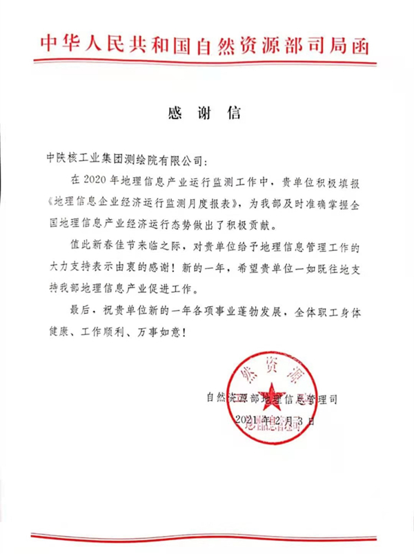 近日,测绘院收到了一份来自中华人民共和国自然资源部的感谢信,感谢测绘院在全国地理信息产业经济运行态势中做出的积极贡献。