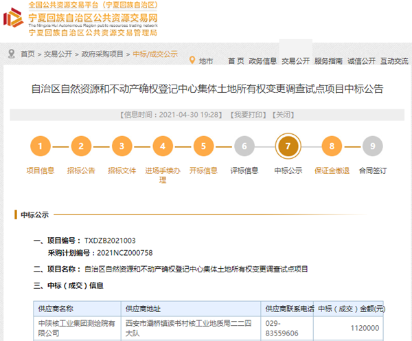 近日,从宁夏回族自治区公共资源交易网获悉,中陕核测绘院中标自治区自然资源和不动产确权登记中心集体土地所有权变更调查试点项目(一标段)。