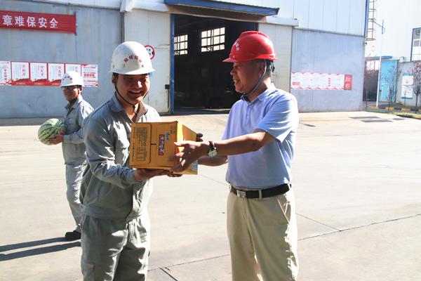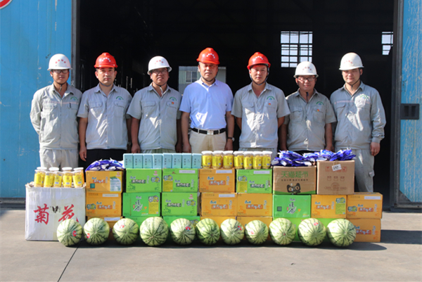 田社生亲手将西瓜、菊花、茶叶、冰糖和清凉饮品等送到一线职工手中,并与车间职工亲切交谈,详细询问大家身体健康、生产生活等情况,并强调,夏季天气持续高温,钼业公司要从就餐、住宿、改善工作环境等多方面入手,多举措保障职工身体健康;要时刻关注高温天气状况,切实做好防暑降温及安全管理工作,从根本源头上确保生产经营健康安全平稳有序。