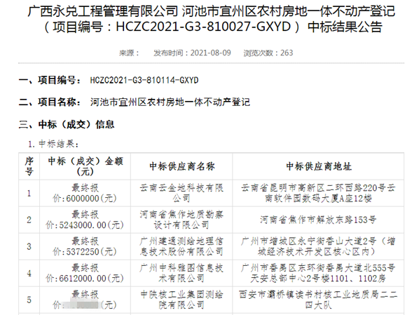 8月9日传来喜讯!中陕核工业集团测绘院有限公司中标广西壮族自治区河池市宜州区农村房地一体不动产登记项目(五标段)。
