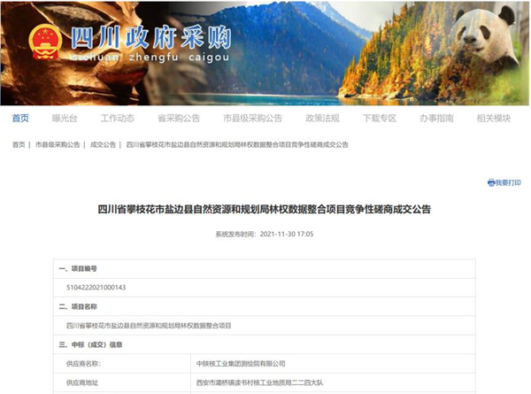 11月30日,从四川省政府采购网获悉,中陕核工业集团测绘院有限公司以专业的技术实力、良好的信誉和丰富的项目经验得到认可,成功中标四川省攀枝花市盐边县自然资源和规划局林权数据整合项目。