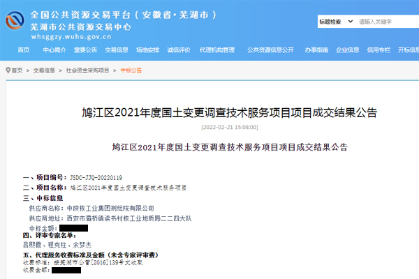 2月21日,从芜湖市公共资源交易中心网站获悉,测绘院成功中标鸠江区2021年度国土变更调查技术服务项目。