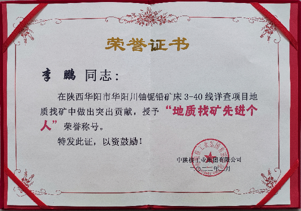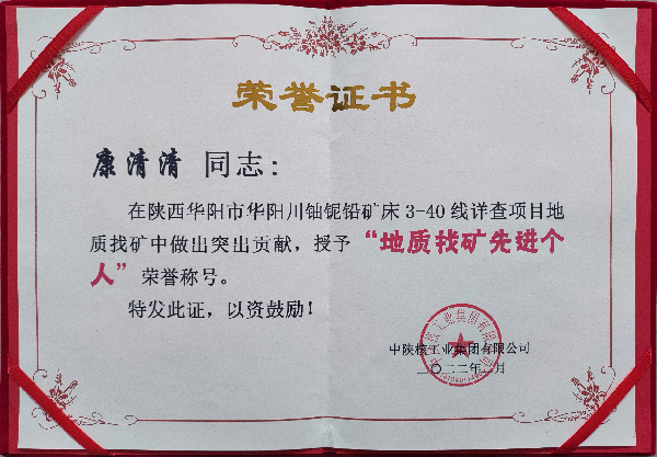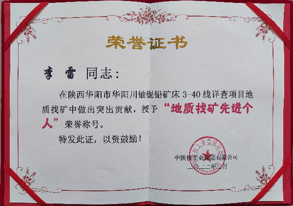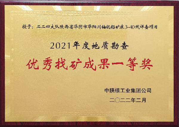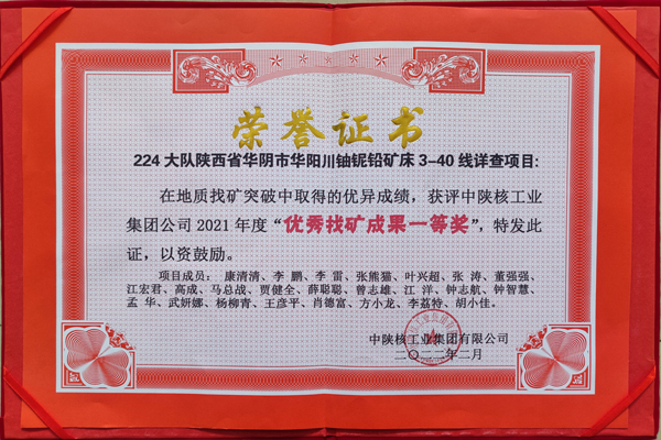 2月24日,在中陕核工业集团公司召开的2022年地矿工作推进会上,地质调查院《陕西省华阴市华阳川铀铌铅矿床3-40线详查》项目获集团公司2021年度“优秀找矿成果一等奖”,项目主要成员康清清、李鹏、李雷等五名技术人员获“地质找矿先进个人”荣誉称号。