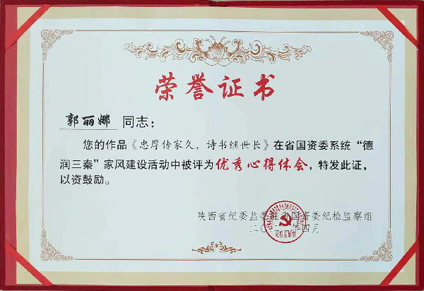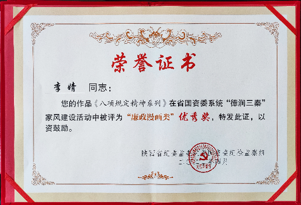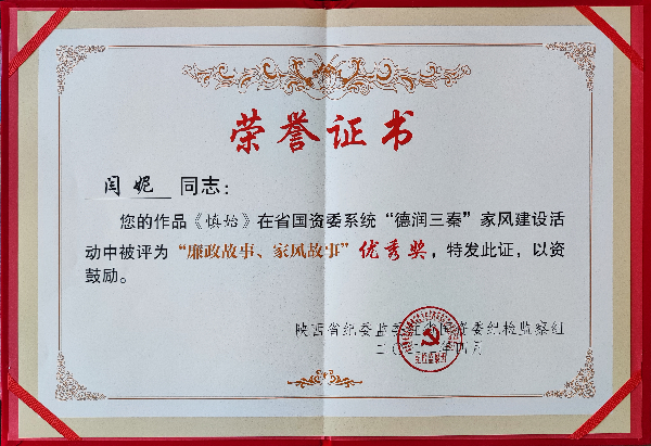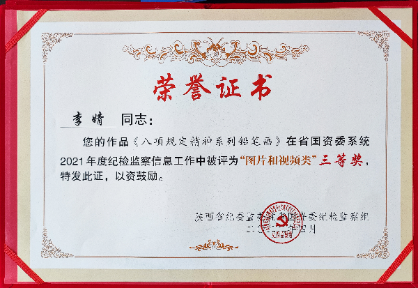 近期,中共陕西省纪委陕西省监委驻省国资委纪检监察组下发了《关于表彰省国资委系统2021年度纪检监察信息工作先进单位、个人和优秀作品的决定》和《关于表彰省国资委系统“德润三秦”家风建设先进单位和优秀作品的决定》,闫妮《慎始》在省国资委系统“德润三秦”家风建设活动中被评为廉政故事、家风故事“优秀奖”;郭丽娜《忠厚传家久,诗书继世长》在省国资委系统“德润三秦”家风建设活动中被评为“优秀心得体会”;李婧《八项规定精神系列铅笔画》分别在省国资委系统2021年度纪检监察信息工作中被评为图片和视频类“三等奖”、省国资委系统“德润三秦”家风建设活动中被评为“优秀奖”。