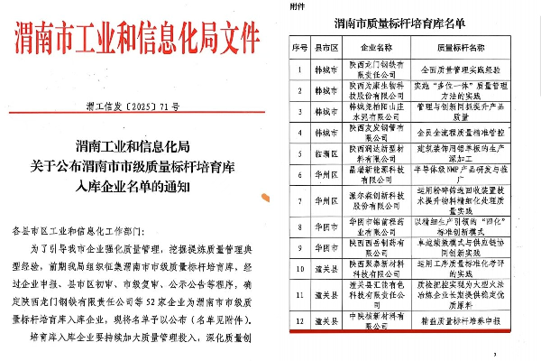近日,渭南市工业和信息化局公布了2025年度市级质量标杆培育库入库企业名单,中陕核新材料有限公司凭借在质量管理领域的卓越实践与突出成果成功入选,成为市级质量标杆培育企业。这一荣誉不仅是对新材料公司多年来坚守质量初心、深耕质量管理的高度认可,更是对其未来持续提升质量水平、引领行业高质量发展的有力鞭策。