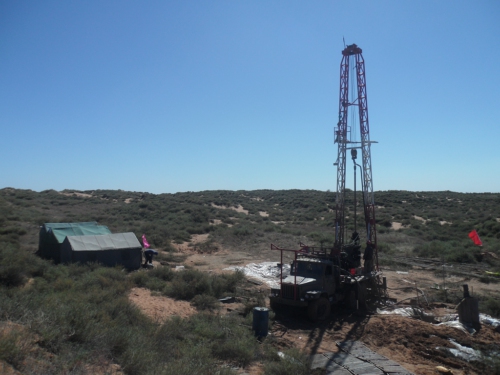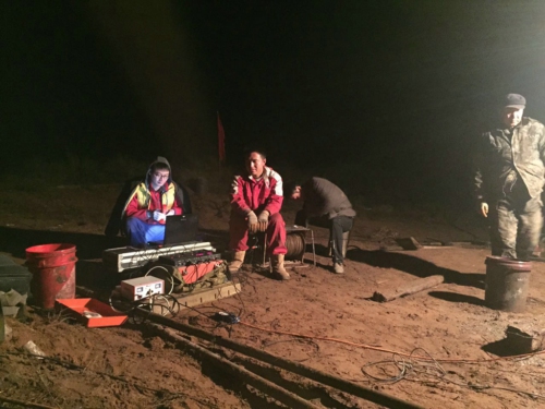 我们租住在中鸡镇上的一户人家里,每天都要去钻机现场编录岩矿芯。钻孔布设在一片荒凉的沙丘堆里,放眼望去,除了沙丘,就是荒草;两位女同志巾帼不让须眉,克服困难,和我们一同走向岩芯编录的前线。由于天气较冷,我们分工明确,检查钻机记录、做物探编录、给岩芯拍照等等,尽量用最少的时间确保资料最高质量?;氐较钅坎?,大家坐在一起整理当天的编录资料,晚饭后继续工作到晚上十点。