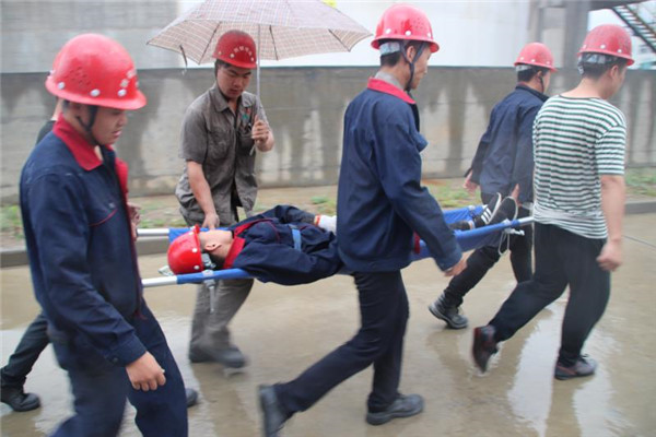 按照公司突发事件应急救援预案,应急救援小组共分为5个组,分别是现场调度组、医疗救护组、疏散警戒组、现场应急处置组、预备役人员组。下午3时,应急救援小组接到通知,硫酸车间有一员工突然晕倒在地,疑为三氧化硫中毒,随后,应急救援小组立即奔赴事发现场开展救援。医疗救护组及时观察患者生命体征,进行了简易处理,并用担架将患者送至救护车上;疏散警戒组在厂区大门等位置拉上警戒线,现场应急处置组对有毒气体泄漏部位进行现场紧急处置,通过各个小组协作,坚守各自的救援责任,整个过程前后衔接连贯,本次演练取得了预期的效果。
