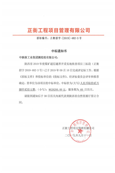 9月11日,测绘院在陕西省2019年度煤矿超层越界开采实地核查项目招标中,凭借过硬的技术、合理的报价、严谨的作风、丰富的经验,在众多地勘单位中脱颖而出,成功中标项目第三标段。