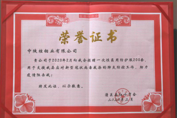 当前,新冠疫情防控工作是公司各项工作的重中之重。在向潼关县红十字会了解到目前潼关县抗疫急需一次性防护服后,公司经过多方努力、多方沟通,从陕西省疫情防控物资指定生产企业购得200套一次性防护服,并于第一时间捐赠给了潼关县红十字会。潼红会负责人对钼业公司在疫情防控阻击战中彰显的责任与担当表示了衷心感谢,并为公司开具了捐赠接收证明,颁发了荣誉证书。当日下午3时,潼红会负责人已通过电联告知,公司捐赠的200套一次性防护服已通过潼关县疫情防控指挥中心,在潼多个疫情防控一线检查站顺利启用。