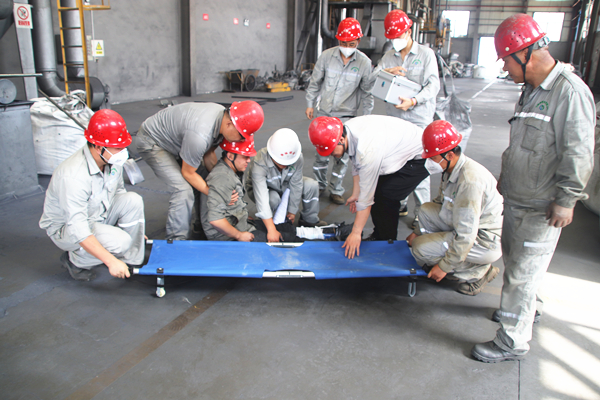 公司安环部负责人首先带领大家学习了起重机械(行车)安全操作规程与事故应急救援知识。随后,进行安全演练。演练模拟氧化钼车间某职工在行车上料作业时,吨包坠落并砸伤行车操作人员。公司第一时间启动起重机械事故专项应急救援预案,组织救援人员赶往事发地进行救援:现场应急救援协调组?;ず孟殖。镁湎?,及时疏散周边人员,并清理通道;救援组营救受伤人员,将受伤人员移到安全地带;医疗救护组拨打120急救电话,进行必要的伤口处理、包扎、夹板固定等简单救护,并指引救护人员前往事发地点救援。经过紧张有序的现场救援,“伤员”得到救治,救援演练圆满结束。
