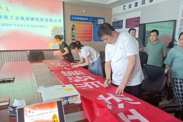 测绘院职工纷纷在印有本次活动主题的宣传横幅上签字,并表示坚决遵守安全法规,创新安全理念,履行安全职责,夯实安全管理,提升测绘院本质安全水平,为测绘院高质量发展提供坚实保障!