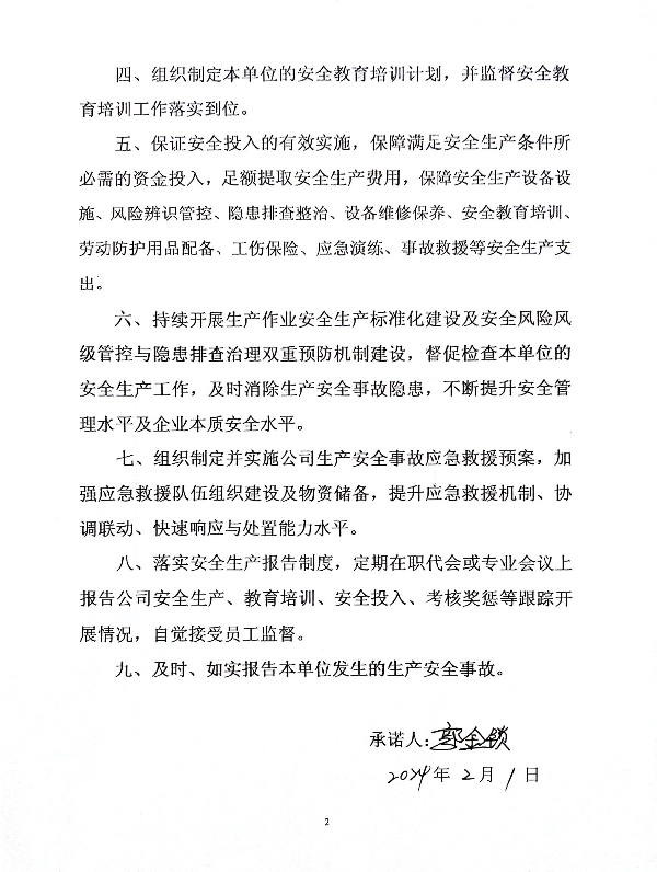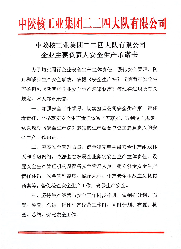 中陕核工业集团二二四大队有限公司企业主要负责人安全生产承诺书