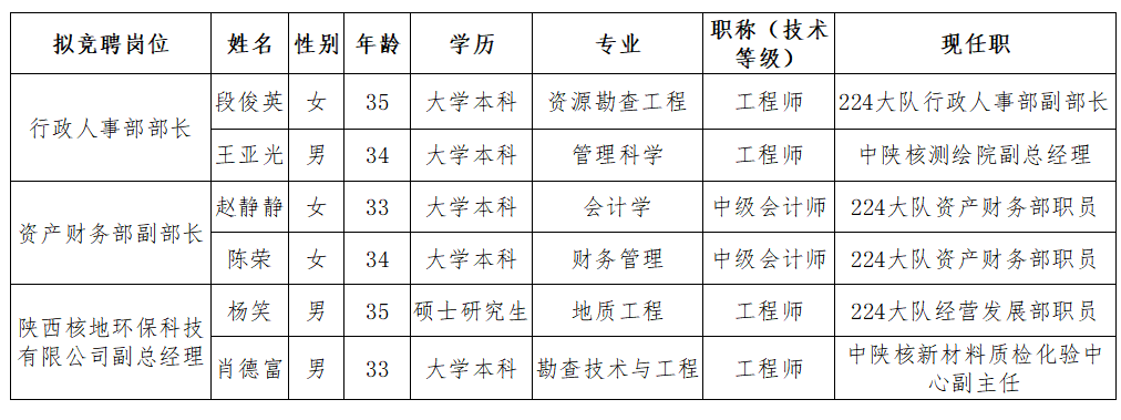 根据《中陕核工业集团二二四大队有限公司关于印发<公司部分中层管理岗位、经理层岗位竞聘工作实施方案>的通知》有关要求,现对资格审查通过的报名人员予以公示。