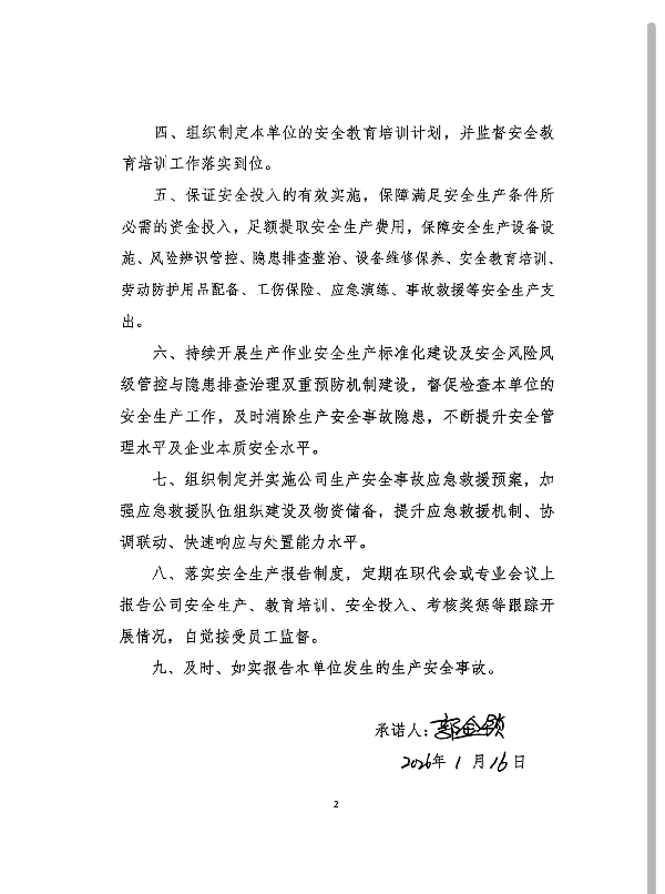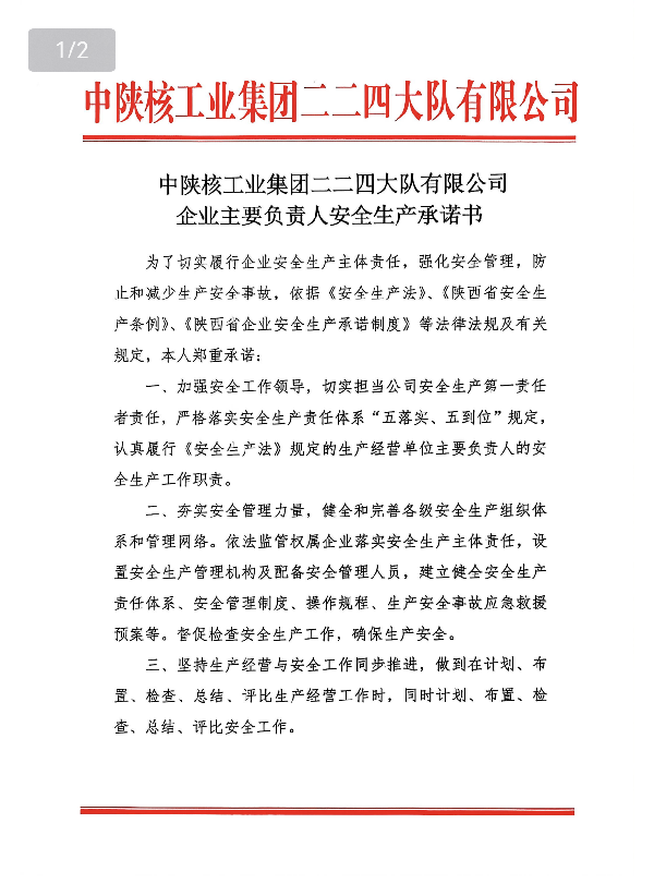 中陕核工业集团二二四大队有限公司企业主要负责人安全生产承诺书