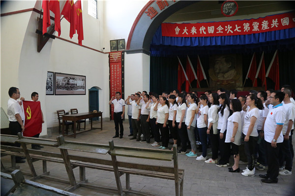 在党中央召开“七大”的纪念馆,郭金锁带领大家面对鲜红的党旗,举起右手、紧握拳头,重温入党誓词,通过重温入党誓词,重温“不忘初心”的承诺,宣誓共产党人坚定的理想信念。郭金锁在主持活动中说到,80字的入党誓词指明了共产党人的初心,落实“不忘初心”才是重温入党誓词的真正目的。共产党员必须坚定理想信念,自觉担负起新时代历史使命,把“不忘初心”落实到具体工作实践之中和敬业奉献之中。